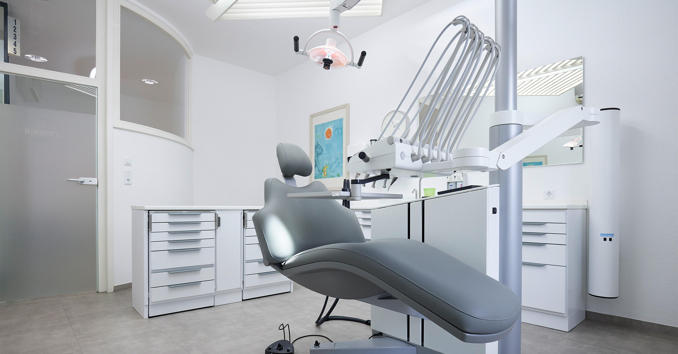 "Ein offenes, neues und modernes Raumkonzept bildet die Grundlage der Gestaltung unserer Praxis. Klassische und moderne Kunst unterstreichen das besondere Designkonzept."